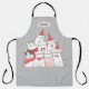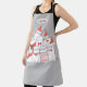 Whimsical Holiday themed apron features hand drawn smiling cats decked out for the Christmas season in Santa caps, bow ties and scarves on gray background. Center text oval can be used to personalize this accessory