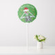 This mylar balloon has a smiling skeleton holding xmas ornaments up to his eyes wearing a red Santa hat circled with shining gold stars on a green background with gold flecks. Customise the Merry Christmas text with the template on the front and back.