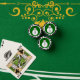 This awesome set of poker chips features a smiling white Christmas snowman with black buttons and a top hat. He looks like one cool gent and would love to help you spread the joy of Christmas this year. The background is a festive shade of green.