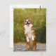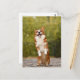 This postcard features a photo of a corgi standing on its hind legs and smiling.