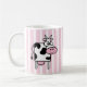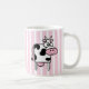 A fun girly animal print design with a smiling cow against a wide striped background in pink and white.