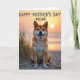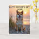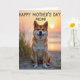 Designed with a serene coastal scene, the card centers on a fox-like dog with orange-and-cream fur, facing forward with a wide, open-mouthed grin and a little pink tongue showing ❤️. Warm golden light brushes its coat, and its perked ears and bright eyes give it the look of a loyal companion sharing a tender, friendly moment with the viewer. Behind it, the sky fades through soft peach and orange tones, suggesting early morning or late evening calm. A gentle sun sits toward the upper right, casting an even glow across the scene and softening the distant horizon. Across the upper portion of the design, the message “HAPPY MOTHER’S DAY MOM!” appears in a casual, hand-drawn look, set in a dark tone that stands out against the light sky 🌼. The dog sits on pale, finely textured sand, and thin dune grasses rise around it like a natural frame. The foreground shows scattered blades of grass curving upward from the sand beneath the dog’s paws.