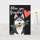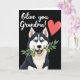 This card features a charming northern sled-dog type portrait in a digital illustration style, with deep charcoal and bright white fur framing a friendly face. The dog’s head and upper chest sit in the lower center, looking straight out with icy blue eyes that feel like a warm, flirty hello ❤️. A small smile lifts its muzzle as it gently holds a green olive branch between its teeth, showing two glossy olives like a sweet offering. Across the upper portion, a short message appears in flowing white lettering, standing out clearly against the dark background. Near the upper right corner, a glowing red heart adds a simple romantic cue, like a quiet “I’m thinking of you.” The black backdrop keeps everything high-contrast and focused, making the dog and the olive branch feel like the whole scene is leaning in close. The olive leaves angle slightly upward, and the red heart sits to the right of the white text near the top edge 🌼.