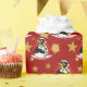 Christmas wrapping paper with an illustration of a cute smiling emperor penguin with a red Santa hat; Christmas holiday cartoon design for kids; Christmas holiday cartoon design for kids, on red background with customizable text template for your name or message; illustrated by Radka Kavalcova