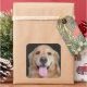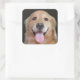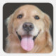 These stickers feature a photograph of a smiling blond golden retriever dog on a black background.