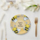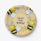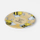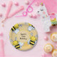 Cute smiling honey bees with custom text to celebrate baby's first birthday party, or any age and occasion, over a golden honey background.