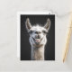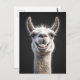 A highly detailed close-up of a smiling white llama with expressive eyes and a friendly, comical expression against a dark background.