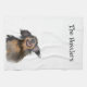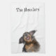 An adorable long haired dachshund smiles engagingly . Personalize the towel with your name or saying. Original art by Leah Wiedemer