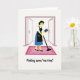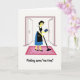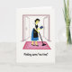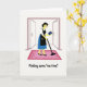 Designed with a retro, flat-color illustration style, the card shows a woman with neatly styled dark hair and a bright yellow-toned complexion standing in a simple indoor room framed by two softly outlined doorways. She wears a white blouse, a deep blue skirt, and a black apron marked with a small yellow “T,” and her yellow shoes echo her skin tone. She leans into a vacuuming pose over a pink rug filled with darker rose shapes, yet her other hand holds an open book with a dark blue cover, as if sneaking a quiet moment for herself ❤️. Her sideways, knowing smile meets the viewer like a friendly wink, adding a cozy sense of companionship to the scene. The palette mixes strong blues and blacks with lively pinks and bright yellow, giving the everyday setting a cheeky, affectionate energy 🌼. Any front text sits near the top in a simple, easy-to-read style, shown in dark blue against the light background. The vacuum hose curves toward the lower edge while the patterned rug spreads across the foreground in pink and rose tones.