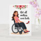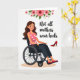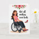 Designed with a bright illustration, this card shows a smiling woman seated comfortably in a dark wheelchair, her relaxed posture and open expression suggesting quiet confidence and care ❤️. Her brown hair falls around her face, and small pearl-like earrings add a gentle touch to the look. She wears a pink top with white polka dots, dark fitted pants, and red flat shoes, positioned slightly to the left so her friendly presence leads the scene. On the right side, set apart on the white background, a single red high-heeled shoe appears like a thoughtful counterpart, as if two different styles are sharing the same moment. Across the top edge, an arch of pink flowers and green leaves frames the artwork with a soft, celebratory feel 🌼. The message “Not all mothers wear heels.” sits above the figures in dark lettering, centered near the upper portion beneath the floral arch. The background stays white with bright, even lighting and faint shadows, and the lone red heel is angled slightly upward with a curved silhouette.