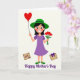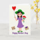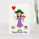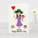 Designed with a stylized young woman at the center, the illustration shows her in a flowing purple dress with a green hat and matching flats, smiling with rosy cheeks that suggest a sweet, affectionate mood ❤️. She holds a red heart-shaped balloon in one hand, the thin string trailing down like a gentle connection. In her other hand sits a small bunch of three heart-shaped flowers in the same deep red, echoing the balloon and adding a romantic, caring touch. The background is a soft off-white that keeps the focus on the simple shapes and rich colors. Near the bottom, the greeting “Happy Mother’s Day” appears centered in purple lettering, sitting neatly beneath the figure. By her feet are two small square notes: one reads “Love X” in dark lettering, and the other is topped with a purple bow, like a tiny gift tag 🌼. The heart balloon floats just above her shoulder, standing out sharply against the pale backdrop.
