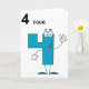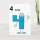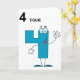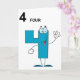 This design should make you smile because it is off a smiling number 4. The number 4 is done in a cartoon style with arms, legs and eyes. The number 4 is in a light blue color and the words 4 four are written above. This smiling number 4 design looks great on these greeting cards