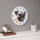 A digital drawing of a Pug. This artistic work by Diane Blackman is based on a photograph. It is a young Pug with a happy expresson. The background is a swirl of pastel colors with a mosaic texture. The clock numbers are a dark reddish brown.