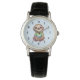 A watch with an adorable illustration featuring a happy looking sloth wearing a green t-shirt. Sitting cross-legged in a relaxed meditation pose.