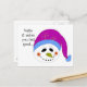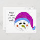 A cute snowman wearing a purple hat with snowflake accents. A big grin and a green carrot nose complete him. The saying can be changed as desired.