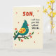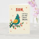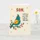 This design shows a stylized teal bird resting in the lower-left corner on a simple branch, with deep green leaves and orange-red blossoms that lean toward it like a friendly companion 🌷. The bird’s belly is bright yellow, decorated with small red floral shapes and scattered white dots that feel like little notes of affection. A sharp red beak points upward, and a white eye with a black pupil gives it an attentive, caring look, as if it’s listening closely. The background is a soft creamy tone, dotted with small orange-red circles that echo the blossoms and create a gentle rhythm across the space. At the top, the word “SON,” appears in large red letters, centered and easy to spot. Beneath it, the line “can’t hear your VOICE without SMILING...” is written in smaller black lettering, with “VOICE” and “SMILING” in uppercase to stand out 🐇. A small white zigzag mark sits on the bird’s chest, adding a simple texture detail.