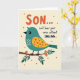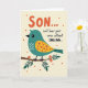 This design shows a teal bird perched on a sturdy brown branch, with dark green leaves and small coral-orange blossoms that feel like a sweet little offering 🌷. The bird has a rounded shape, a tiny black dot eye, and a bright yellow chest panel decorated with small coral-orange flower shapes, like it’s dressed up for someone special. Above the illustration, the word “SON...” appears in large warm coral letters near the top, drawing the eye first. Beneath it, a smaller, casual line reads “can’t hear your voice without SMILING...,” with “SMILING” set in uppercase for extra emphasis. The pale cream background is sprinkled with scattered coral dots, giving the scene a light, airy look 🐇. The gentle curve of the bird’s body and the cozy spacing between the branch, blossoms, and text suggest an affectionate closeness, like a message meant to be kept nearby. Coral dots float across the cream backdrop around the bird and the lettering.