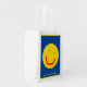 A green-eyed yellow sun smiling on a blue background. Add your own text. You may change the color of both the text and the background. You may also change the border color or remove it completely.