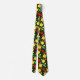 A novelty tie with a pattern of fun, smiling, fruit and vegetable characters on a dark green background.
