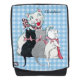 This Bold Face adult backpack with a interchangable front face has a smiling white mother cat sitting with her three kittens in black, white and gray all wearing bows on a blue and white plaid background. Customize your name with the template.