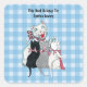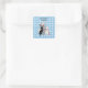 This square sticker bookplate label is a light blue and white plaid pattern with a smiling white mother cat sitting with her three cute kittens who are black, white, and gray all wearing pink ribbons. Customize your text with the templates.