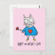 Funny little gray cartoon kitten with googly eyes, wearing a blue dress with a red heart on the front, yellow shoes, holding a red rose. Sometimes love is silly. Original cartoon art by Taylor Addams.