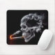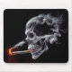 A wispy skull made from smoke emerges, gripping a lit cigarette between its teeth