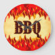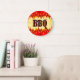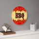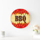 A wall clock reading BBQ in western smoldering letters, with graphic art of red and orange flames at the top and bottom of the design on a rustic grunge background.