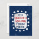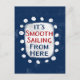 Bold text reading "Smooth Sailing From Here" is centered against a navy blue background. The red and blue text sits on a white rectangle with large textured white dots around it, providing a playful contrast against the solid color backdrop.