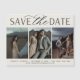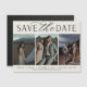 A modern save the date magnet designed to accommodate 3 vertical photos aligned side by side. "Save the date" appears across the top in chic block and script lettering, with your names, wedding date and wedding location beneath, along with your wedding website or additional details.