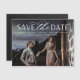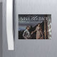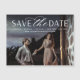 A modern save the date magnet designed to accommodate your favorite horizontal or landscape oriented full-bleed engagement photo. "Save the date" appears near the top of your photo in white block and script lettering, with your names, wedding date and wedding location beneath. Use the additional line of text to share your wedding website or additional details.