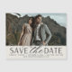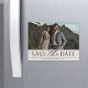 A modern save the date magnet designed to accommodate a single horizontal or landscape oriented engagement photo. "Save the date" appears beneath in chic block and script lettering, with your names, wedding date and wedding location beneath, along with your wedding website or additional details.