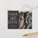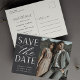 A modern save the date postcard designed to accommodate your favorite vertical or portrait oriented engagement photo. "Save the date" appears alongside your photo in off-white block and script lettering, with your names, wedding date and wedding location beneath. Postcards reverse to show additional save the date details, including your wedding website, with your return address and space for recipient addressing.