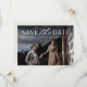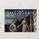 A modern save the date card designed to accommodate your favorite horizontal or landscape oriented full-bleed engagement photo. "Save the date" appears at the top of your photo in white block and script lettering, with your names, wedding date and wedding location beneath. Cards reverse to show additional save the date details.