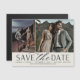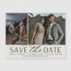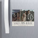 A modern save the date magnet designed to accommodate two engagement photos aligned side by side. "Save the date" appears beneath your photos in chic block and script lettering, with your names, wedding date and wedding location beneath, along with your wedding website or additional details.