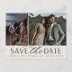 A modern save the date postcard designed to accommodate two engagement photos aligned side by side. "Save the date" appears beneath your photos in chic block and script lettering, with your names, wedding date and wedding location beneath. Postcards reverse to show additional save the date details, including your wedding website, with your return address and space for recipient addressing.