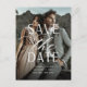 A modern save the date postcard designed to accommodate your favorite vertical or portrait oriented full-bleed engagement photo. "Save the date" is overlaid on the center of your photo in white block and script lettering, with your names, wedding date and wedding location beneath. Postcards reverse to show additional save the date details, including your wedding website, with your return address and space for recipient addressing.