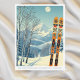 Hello from the snowy mountains of Smugglers Notch, Vermont, USA! We hope you're having a wonderful ski vacation. This postcard features a gorgeous blue-grey mountain landscape with retro ski boards in an orange tribal pattern.