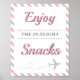 "Enjoy the in-flight snacks" food table sign that can be used for a travel/airplane themed baby shower, sprinkle, birthday or another occasion. This design will look best in 8" x 10" or 16" x 20". If you're looking for another size, please contact us to have it fitted correctly.