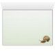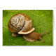 This blank card features a garden snail emerging from his shell on a green leaf. He is a terrestrial gastropod mollusk with a brown and beige shell in the classic spiral pattern. His tentacles each have an eye at the end and are pointing ahead as he figures out where to go, pushed along by his strong muscular foot. A smaller snail is inside on a pale green gradient.