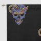 Spooky Skull featuring an unusual original pattern made up of layers of skulls, devils, demons, and reaching hands is rendered even more ghoulish by the Diamond Back Snake that has coiled itself around the skull and through the eye sockets, looking at YOU right in the eye while stretching its' tongue. Designed by Leslie Sigal Javorek.