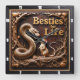 This dramatic square wall clock features a highly dimensional, close-up illustration of a coiled tan and brown snake and a small, pale rat standing next to each other. The entire design is rendered in muted brown, tan, and dark wood tones, strongly suggesting a deep carved relief or Engraved Wood Look. The snake has detailed scales, and the rat has textured fur, a long tail, and is looking up. They are framed by a prominent, gnarled tree root structure and stylized small rocks. The background is a dark, rust-brown color with textured wood grain. The large, three-dimensional embossed text "Besties for Life" is carved in a gold-colored serif font across the top. The clock face features a simple clock face border with large, white, numbered tick marks (1 to 12) integrated into the outer frame. The artwork is surrounded by a thick, dark brown decorative border that resembles a black wood frame.