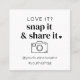 A modern, minimal 'Love it? Snap it & share it' card, designed to be placed in with your orders for your small business, and to spread the word about your brand! It features a little heart shape next to the main text and also a camera icon underneath. You can add your own business name and hashtag, or change that part to something that suits you.