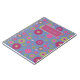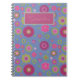 Snazzy personalized notebook with purple and green flower power pattern on a blue background.
