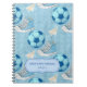Boys' watercolor illustration featuring soccer balls, sneakers, and blue stripes.