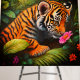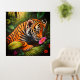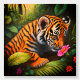 A fluffy cub, filled with innocent curiosity, dips its nose towards a cluster of vibrant wildflowers. Its dark eyes gleam with wonder as it sniffs the sweet fragrance, a tiny pink tongue peeking out in concentration. The cub's playful posture, with one paw gently raised, hints at its eagerness to explore the world around it.