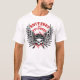 Badass steel skull with straight-razor wings, leather helmet & goggles, "Snitches Get Stitches" in Gothic lettering, and red splatter background. T-shirts & gift swag.