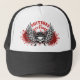 Badass steel skull with straight-razor wings, leather helmet & goggles, "Snitches Get Stitches" in Gothic lettering, and red splatter background. T-shirts & gift swag.