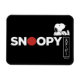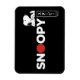 Snoopy relaxes against a rock on top of his name in English and Japanese.
