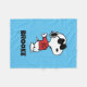 Add a bold pop of color and personality to your space with this Personalized "Joe Cool" Blue Fleece Blanket. Featuring a vibrant design, this cozy throw highlights Snoopy in his iconic "Joe Cool" persona—shades on, red sweater popping—set against a solid, bright blue background, with your name customized in bold black text below.